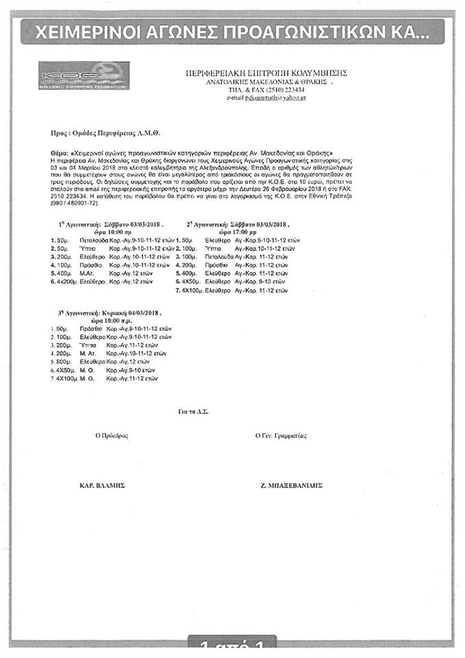 Παρακαλούνται όλοι οι κριτές χρονομέτρες που θα συμμετέχουν στους Χειμερινούς Αγώνες Κολύμβησης Προαγωνιστικών Κατηγοριών , που θα πραγματοποιηθεί 3 και 4 Μαρτίου 2018 να βρίσκονται στο κολυμβητήριο το Σάββατο στις 7.45πμ...