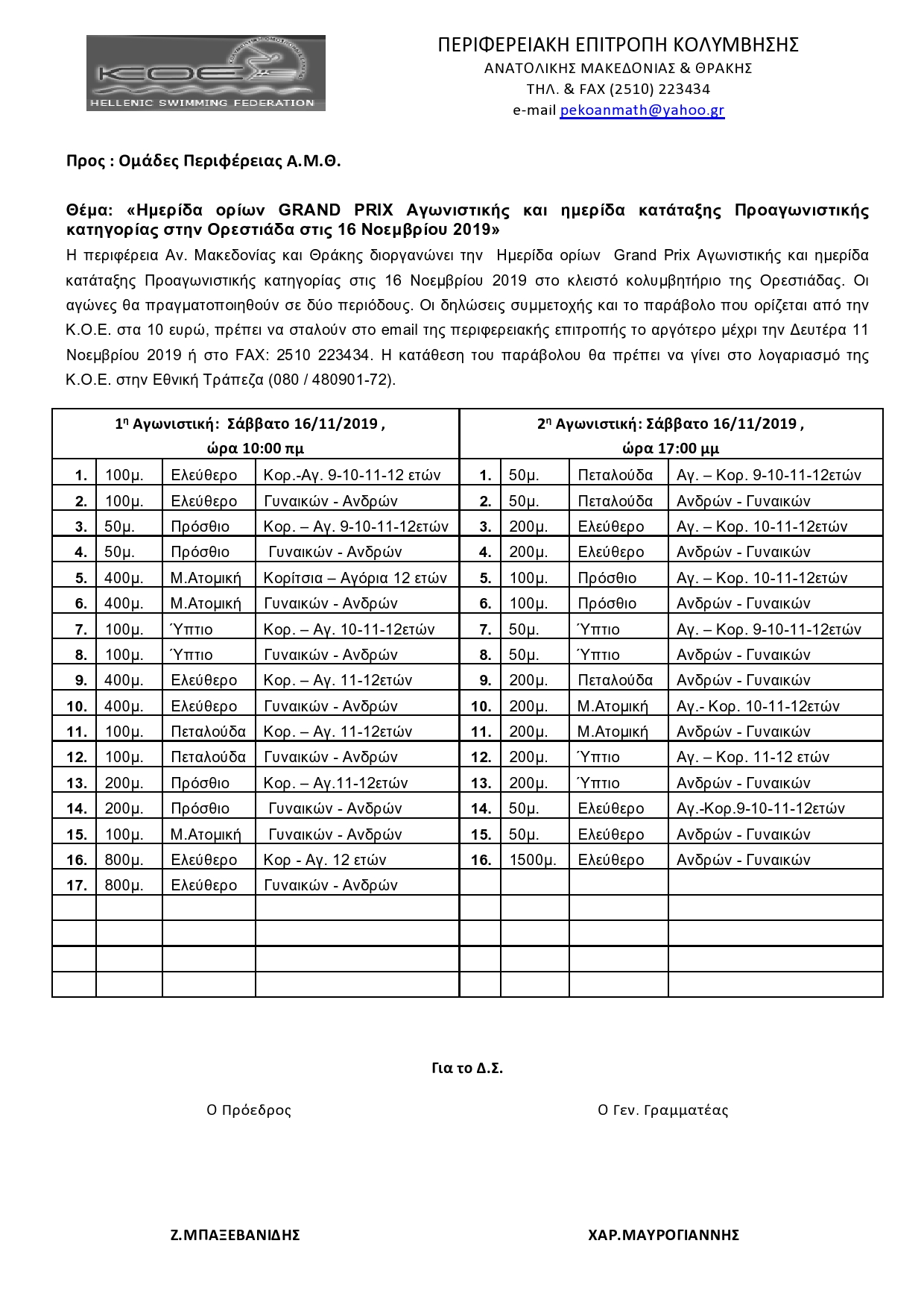 Περισσότερα..Το Σάββατο 16/11/2019 και στις 7.00πμ. αναχωρεί από το Δημοτικό Κολυμβητήριο ” Δημοσθένης Μιχαλεντζάκης ” η Αγωνιστική ομάδα του ΟΦΘΑ για την πόλη της Ορεστιάδας , όπου θα διεξαχθεί η Ημερίδα Grand-Prix για τους 50 καλύτερους χρόνους σε Πανελλήνιο επίπεδο Ανδρών και Γυναικών...