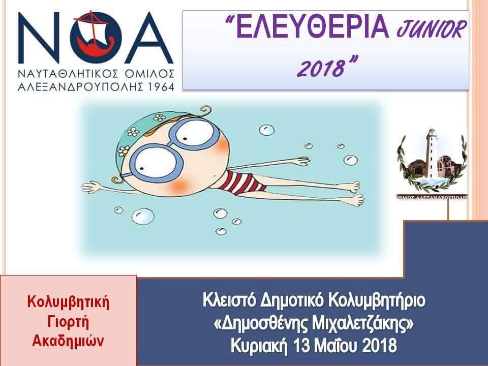 Σήμερα Κυριακή 13 Μαΐου 2018 πραγματοποιήθηκε στο κολυμβητήριο της πόλης από τον Ναυταθλητικό Όμιλο Αλεξανδρούπολης σε συνεργασία με τον Δήμο Αλεξανδρούπολης, ημερίδα κολύμβησης ακαδημιών ηλικίας 6-9 ετών...