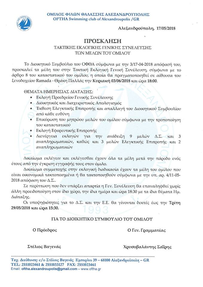 Περισσότερα..Το Διοικητικό Συμβούλιο του ΟΦΘΑ σύμφωνα με την 3/17-04-2018 απόφασή του, προσκαλεί τα μέλη του στην Τακτική Εκλογική Γενική Συνέλευση, σύμφωνα με το άρθρο 8 του καταστατικού του ομίλου, η οποία θα πραγματοποιηθεί σε αίθουσα του ξενοδοχείου Ramada – Θράκη Παλλάς την Κυριακή 03/06/2018 και ώρα...
