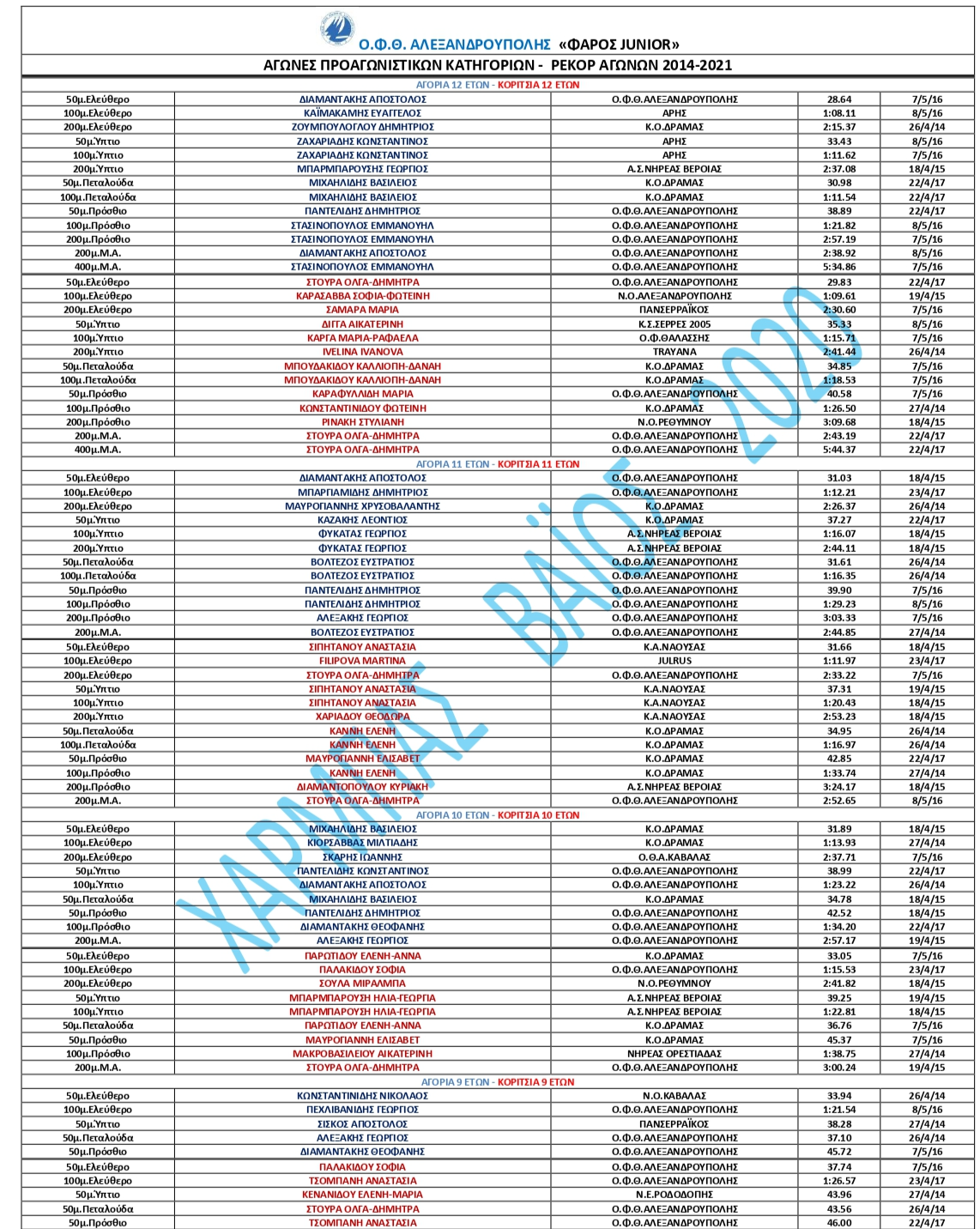 5. | 200μ. | ΕΛΕΥΘΕΡΟ | ΑΓΟΡΙΑ – ΚΟΡΙΤΣΙΑ | 11-12 ΕΤΩΝ |